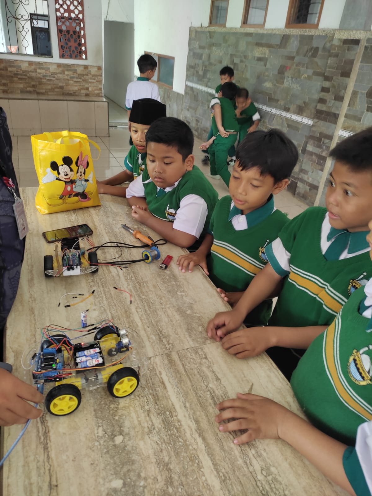 Selain perangkat lunak, siswa juga dikenalkan pada penerapan pemrograman pada perangkat fisik melalui demonstrasi mobil robot Obstacle Avoiding Car. Robot berbasis Arduino ini mampu bergerak secara mandiri dan menghindari rintangan menggunakan sensor.